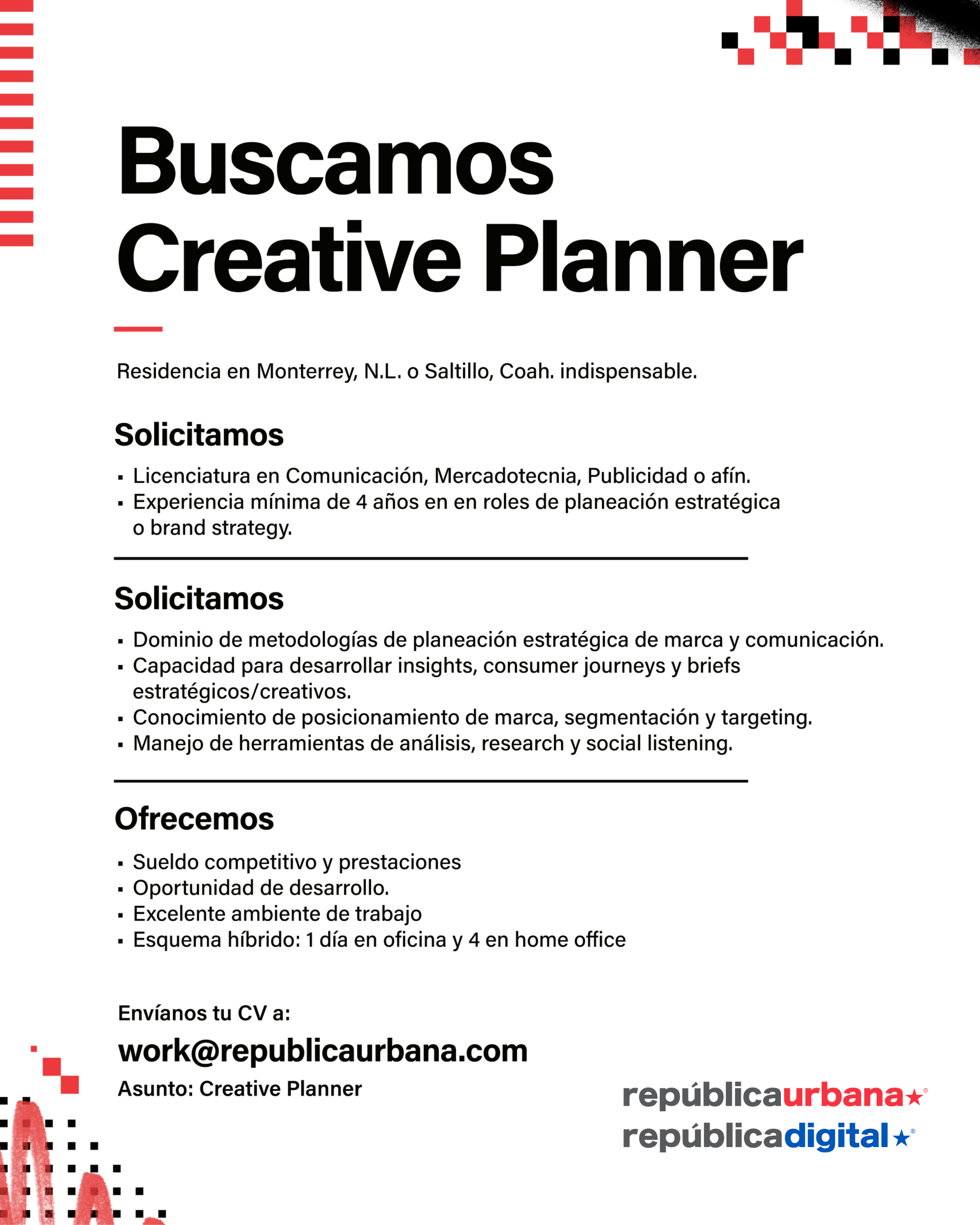 — Capacidad para desarrollar insights, consumer journeys y briefs estratégicos/creativos.